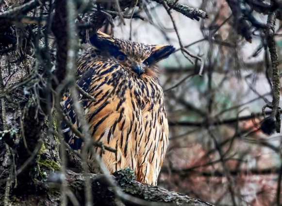 鉴别特征:体长约60 cm,大型鸮类。体形似褐渔鸮,稍大,耳羽簇明显,具白色喉斑,整体橙棕色,上体具黑褐色宽阔羽干斑纹,下体具黑褐色细羽干纵纹。