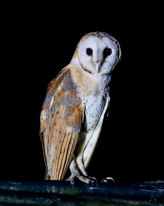 鉴别特征:体长约37 cm,体形中等的鸮类。具白色心形面盘,上体为斑驳的棕黄色且具黑色和白色斑点,下体白色且散布暗褐色斑点。