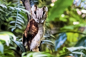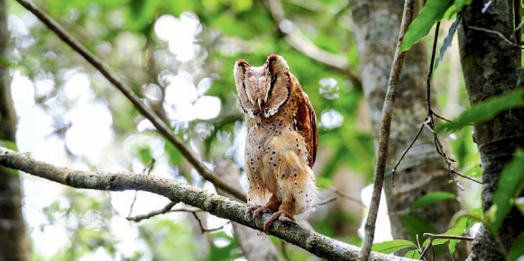 鉴别特征:体长约29 cm,体形中等的栗红色鸮。体形似仓鸮,但相对小,心形面盘,头两侧有羽簇突起,上体栗红色且具黑白色斑点,下体皮黄色且散布黑色斑点,尾短,具黑色横斑。