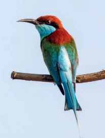 鉴别特征:体长约30 cm,体形中等的蜂虎。头顶至上背部为栗色,喉部和尾部蓝色,其余部分绿色,具黑色贯眼纹。亚成鸟尾羽短,头顶至上背绿色。