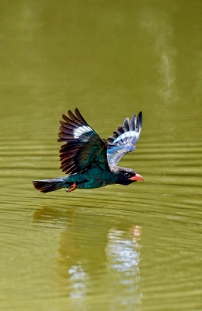 鉴别特征:体长约30 cm,体形中等。喙红色(亚成鸟黑色),形状宽厚。头近黑灰色,喉蓝紫色,其余部分暗蓝绿色。飞行时可见蓝白色翅斑。