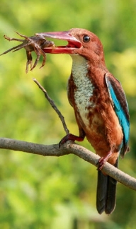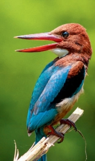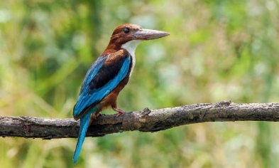鉴别特征:体长约27 cm,中大型翠鸟。全身以蓝色、褐色、白色为主。颏至胸白色,头、颈、肩和下体褐色,翼上、背部至尾部亮蓝色,飞行时翅尖呈黑褐色。