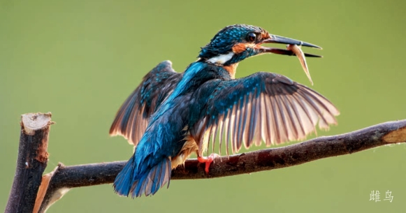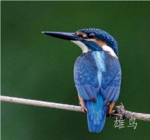 鉴别特征:体长约16 cm,小型翠鸟。上体亮蓝色,下体棕色,背部具浅金属蓝色,颏白色,耳羽橘黄色,具有橘黄色贯眼纹。雄鸟喙全黑色,雌鸟下喙橘黄色。