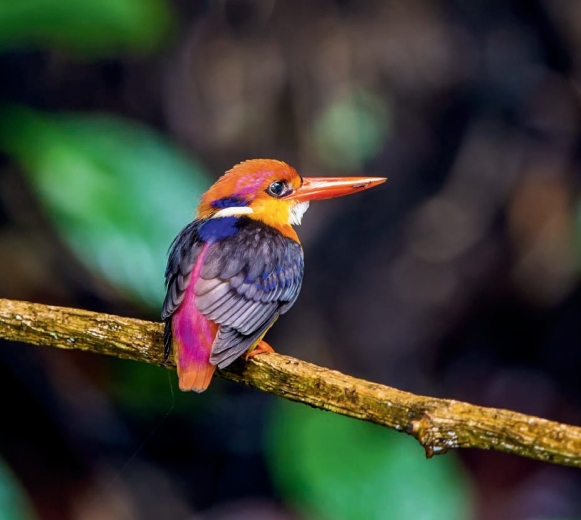 鉴别特征:体长约14 cm,小型翠鸟。全身以橙红色与蓝紫色为主,喙橙红色,头顶亮红褐色,枕部两侧具蓝紫色斑。背部和翼上覆羽蓝紫色,喉部至整个下体为明黄色。