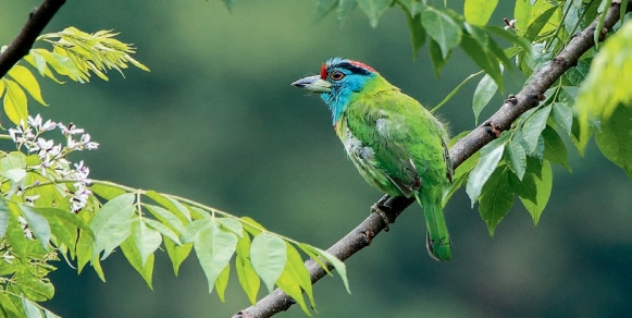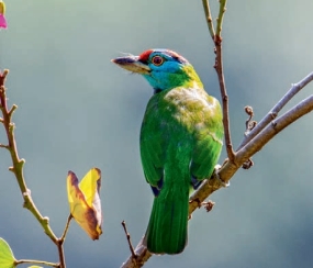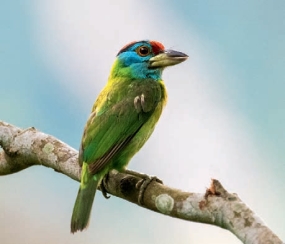 鉴别特征:体长约20 cm,中小型拟啄木鸟。喙尖黑色,基部浅黄绿色。头顶红色,中间有一黑色带,头部其余部分蓝色。前胸两侧各一红斑,身体其余部分绿色或浅绿色。