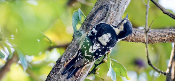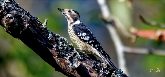 鉴别特征:体长约15 cm,中小型啄木鸟。喙短尖,全身具黑白相间的条纹,背部黑色具白斑,腹部白色略带棕色,并具深灰色纵纹。雄鸟枕部两侧具红色条纹。