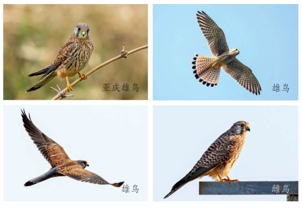鉴别特征:体长约37 cm,小型猛禽。背部多为砖红色,具黑色斑点,眼下具明显的黑褐色髭纹。雄鸟头顶和颈部灰色。飞行时翼指不明显,尾端黑色明显。