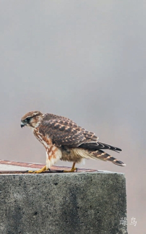 鉴别特征:体长约28 cm,小型猛禽。雄鸟上体多青灰色,并具黑色纵纹,颈具褐色领圈,下体土黄色。雌鸟和亚成鸟褐色,眉纹更明显。