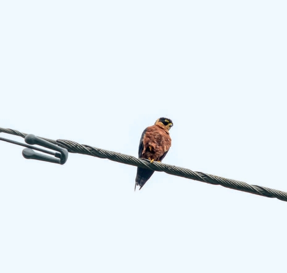 鉴别特征:体长约26 cm,小型猛禽。上体黑色,下体浓栗色,具黄色眼圈。亚成鸟下体具黑色细纵纹。