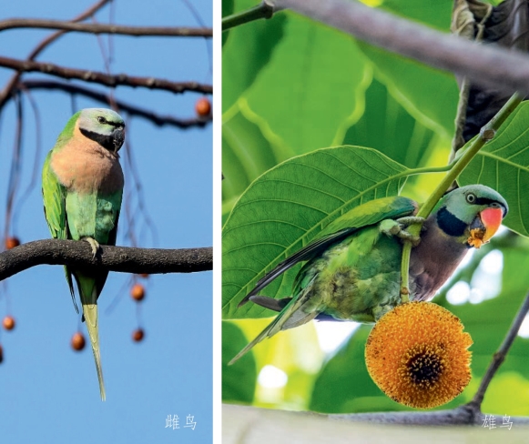 鉴别特征:体长约34 cm,体形中等的胸部粉红色的鹦鹉。成鸟头紫灰色,具明显的黑色髭纹和眼先。亚成鸟的头黄褐色。雄鸟喙显红色,雌鸟喙多黑色。