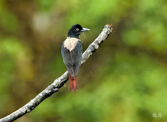 鉴别特征:体长约28 cm,中等体形的林鸟。雄鸟头、翼黑色,体羽银白色具隐粉红斑,尾红褐色。雌鸟头、翼黑褐色,背羽灰色,下体白色并具黑纵纹。