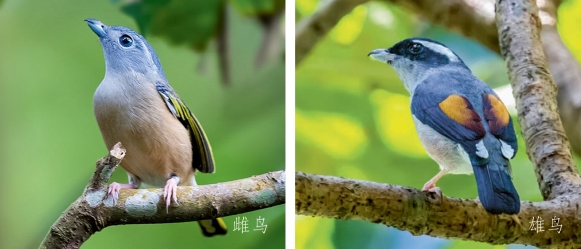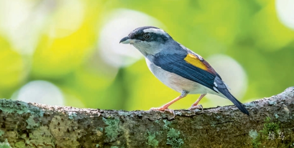 鉴别特征:体长约17 cm,中等体形的鹛类。雄鸟上背部为灰色,头、翼和尾均为黑色,具白色的眉纹,三级飞羽黄色。雌鸟颜色较浅,头部为灰色。