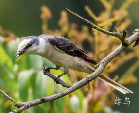 鉴别特征:体长约18 cm,体形略小的山椒鸟。大部分体羽黑色、灰色及白色,前额明显白色。腰部颜色略浅,沾褐色。下体羽色污白。