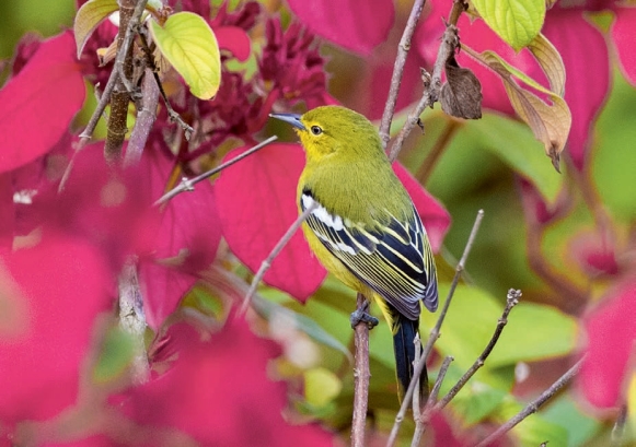 鉴别特征:体长约14 cm的黄色和绿色小鸟。上体橄榄绿色,下体黄色,翼黑色并具显著的白斑。