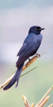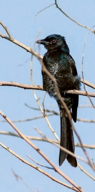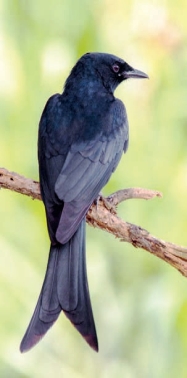 鉴别特征:体长约30 cm,中等体形的林鸟。全身羽毛蓝黑色并具辉光。喙小,喙角具不太明显的白点。尾长而分叉深。