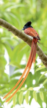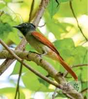 鉴别特征:体形小巧,但加上尾羽会很长。头部闪辉黑色,雄鸟有特别的长尾,具白色和栗色两种色型。雌鸟无长尾,上体及尾羽均为红褐色。