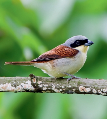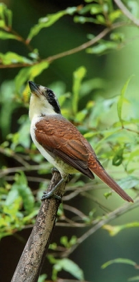 鉴别特征:体长约19 cm,中等体形的伯劳。头顶及颈背部灰色,背部、两翼及尾羽深栗色且多具黑色横斑,下体颜色纯白。雄鸟贯眼纹明显。