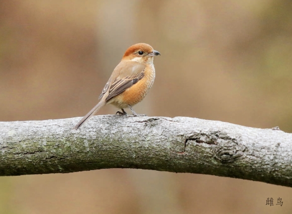 鉴别特征:体长约21 cm,中等体形的褐色伯劳。雄鸟头顶及枕部栗红色,背羽灰褐色,黑色贯眼纹明显,下体棕白色。雌鸟头顶颜色与雄鸟相似,贯眼纹为栗褐色但不完整,仅限于眼后。