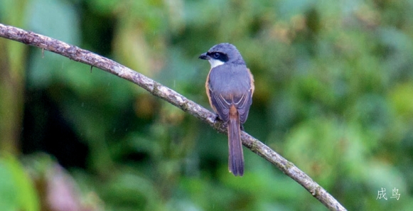鉴别特征:体长约25 cm,体形略大而尾长的伯劳。具黑色贯眼纹,上体暗灰色,翼和尾羽黑褐色。下体近白色,胸部染锈棕色。