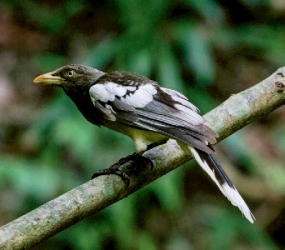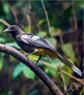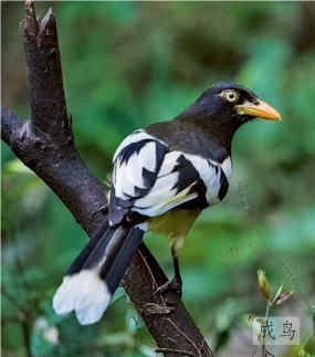 鉴别特征:体长约46 cm。身体多为黑色,喙橘黄色,翼及尾羽具白色的斑。尾楔形,较长。