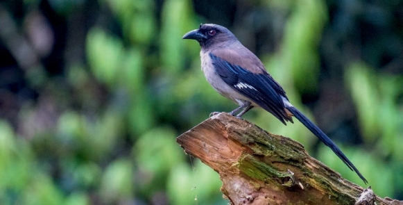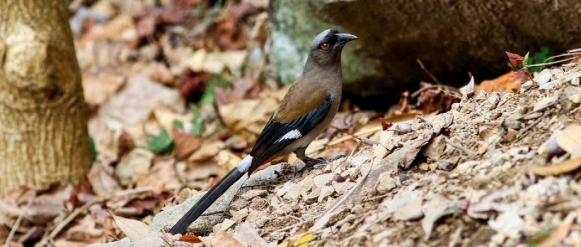 鉴别特征:体长约33 cm的褐灰色树鹊。黑色喙强健而稍弯曲,头顶及上背部为暗石板灰色,两翼及楔形的尾黑色,初级飞羽基部具白色斑块,腰部白色,臀部红褐色。