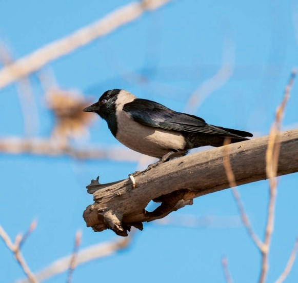 鉴别特征:体长约32 cm的中小型鸦类。成鸟体色以黑色为基色,颈部、胸部及腹部污白色。