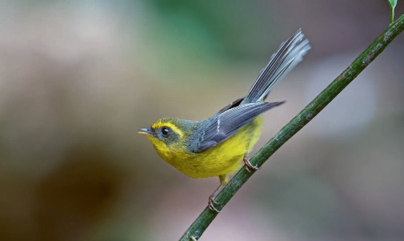鉴别特征:体长约12 cm的小型鹟类。上体橄榄色,前额、眉纹及下体鲜黄色,贯眼纹黑色,扇形的尾甚长,尾端白色。雌鸟羽色稍淡,贯眼纹深绿色。