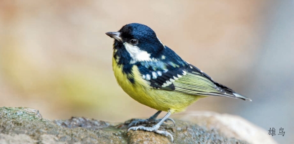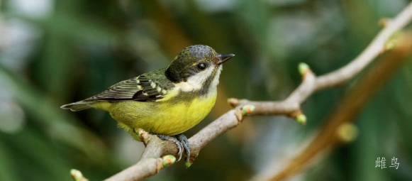 鉴别特征:体长约10 cm的小型山雀。喙短,胸腹部鹅黄色,翼上具两排白色斑点。雄鸟头部及胸部黑色,颈后部及颊部具白色斑块。雌鸟和幼鸟多为橄榄色。