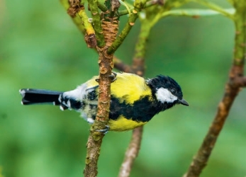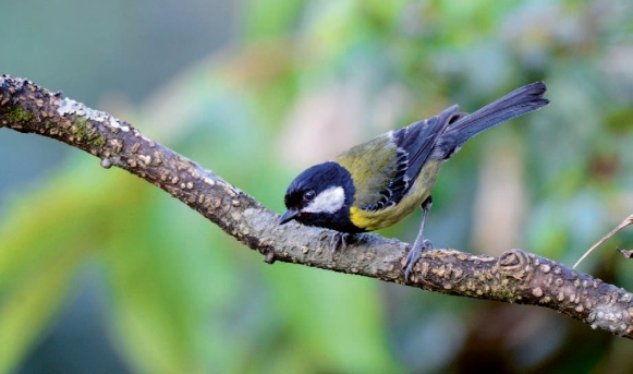 鉴别特征:体长约13 cm的中型山雀。头部及后颈黑色,颏部、喉部和前胸黑色相连形成带状,颊部具三角形白斑,上背和两肩黄绿色,腹部淡黄色,翼表具两道明显的白色翼斑。