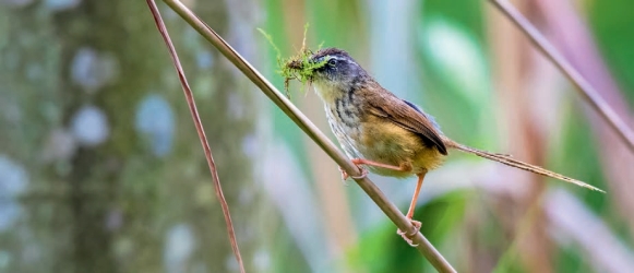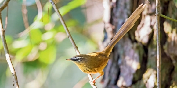 鉴别特征:体长约 16 cm,体形略大的鹪莺。上体褐色,颊部灰色,具明显的白色眉纹,胸部带有黑色纵纹,两胁黄褐色,凸形的尾很修长。