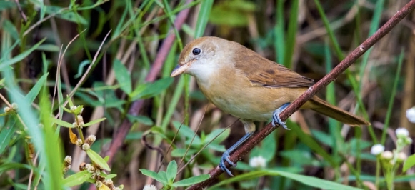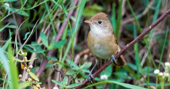 鉴别特征:体长约19 cm的大型莺类。喙短而粗壮。上体橄榄褐色,下体白色或浅灰白色,胸侧、两胁和尾下覆羽淡棕色。