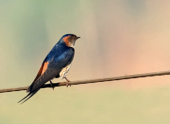 鉴别特征:体长约20 cm的大型黑栗色燕类。上体多为黑色并具蓝黑色金属光泽,腰部和颊部栗色,腰部具黑色的羽干纹。下体污白色,具多条黑色的细小纵纹。尾呈深叉形。