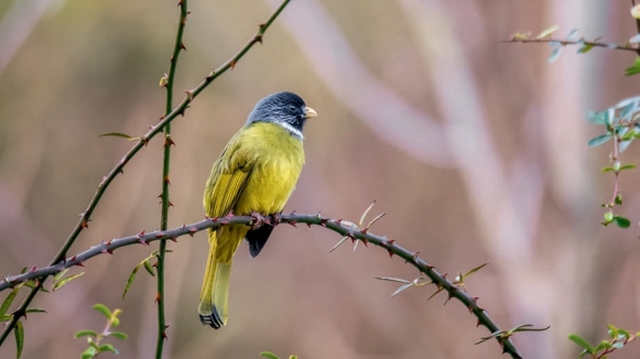 鉴别特征:体长约 23 cm。象牙色的喙较短粗。全身羽毛偏绿色,头部偏灰色,前颈具白色领环,尾羽绿色但端部黑色。