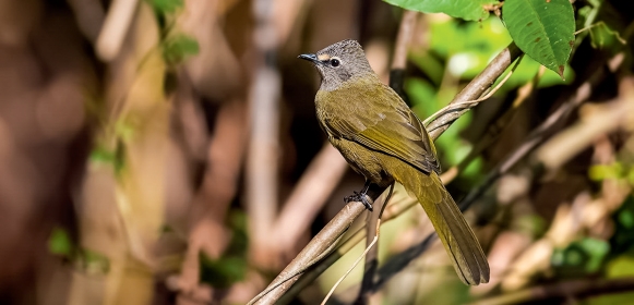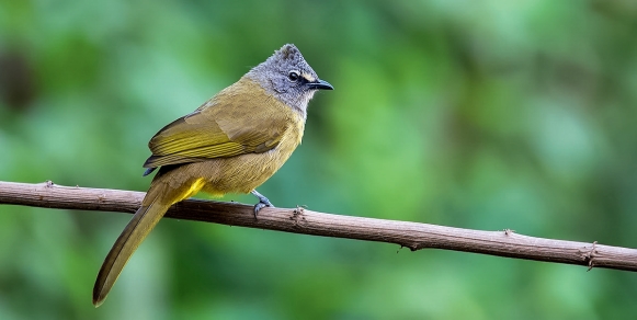 鉴别特征:体长约20 cm。上体多为橄榄绿色,头部偏灰色,具较短的黄白色眉纹和不明显的羽冠。下体灰褐色,臀部浅黄色。