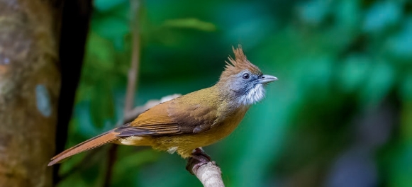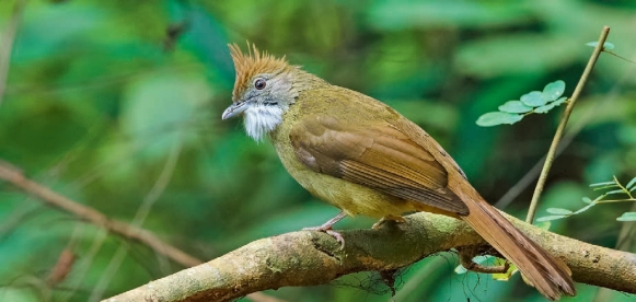 鉴别特征:体长约 23 cm。上体橄榄褐色,头顶具尖而形态不规则的冠羽。下体浅黄色,白色喉部羽毛膨出较明显。