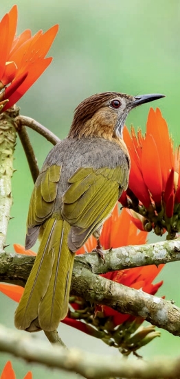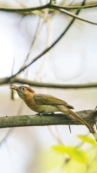 鉴别特征:体长约24 cm。头部栗褐色,具不太明显的羽冠。两翼及尾羽偏绿色,腹部及臀部偏白色。