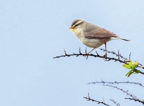 相似种:棕腹柳莺。腹部更偏棕色,眉纹较不清晰,耳羽斑驳与头顶相似,喙较短,下喙尖端较深。