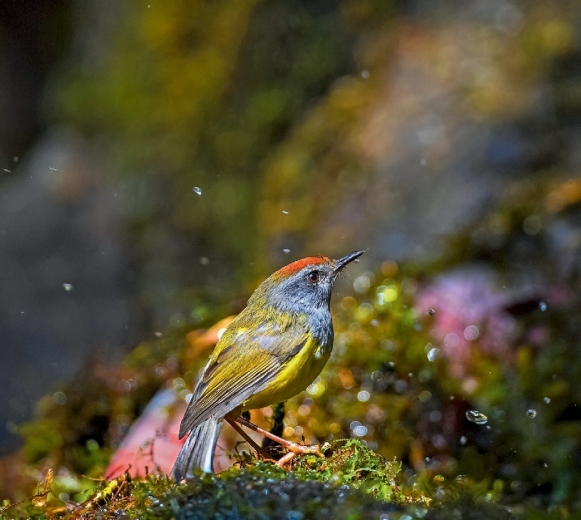 鉴别特征:体长约10 cm。上体深橄榄绿色,前额至头顶栗色,具白色眉纹和深褐色贯眼纹。颏部、喉部、胸部均为灰色,下体余部为柠檬黄色。