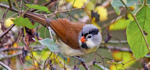 鉴别特征:体长约17 cm。唯一具灰色头部的大型鸦雀。具黑色长眉纹及喉部。背部和尾部褐色,与污白色的腹部、灰色的头部对比明显。喙为显眼的橙黄色。
