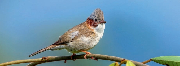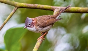 鉴别特征:体长约13 cm,体形较小的鹛类。上体多灰色,头部具不太明显的灰色羽冠,颊部至后颈部为栗色,尾羽褐灰色,外侧尾羽具明显的白斑。