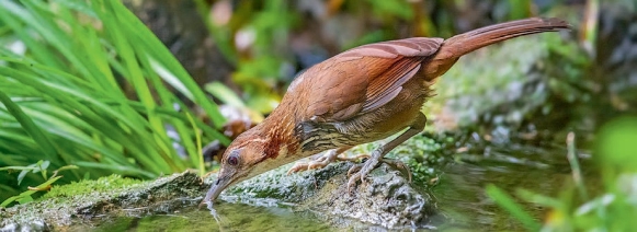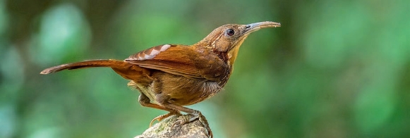 鉴别特征:体长约27 cm,体形较大的钩嘴鹛类。上体褐色,耳羽后方锈色。下体偏白,但胸侧及两胁均为烟褐色而具白色纵纹。