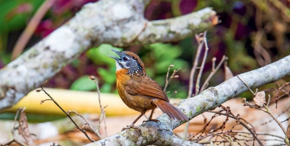 鉴别特征:体长约16 cm,体形略小的鹛类。上体多为橄榄褐色,头顶及颈背部偏栗色,耳羽深灰色,颈侧具明显的黑白斑纹。