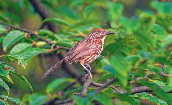 鉴别特征:体长约26 cm,体形略大的鹛类。体羽多为灰褐色,背部和两胁均密布栗褐色的纵纹,具深棕褐色髭纹,尾羽较长。