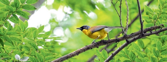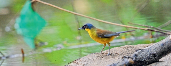 鉴别特征:体长约23 cm。头部靛蓝色,脸黑色且在额前方相连,喉部明黄色,腹部黄色沾灰色。背部、翼及尾羽均为褐色。