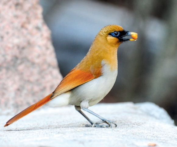 鉴别特征:体长约28 cm。上体棕色偏黄,翼和尾羽均为红棕色,喙基和眼周围具特征性的蓝色。喉部及上胸棕黄色,与灰色的胸腹部及纯白色的臀部对比明显。
