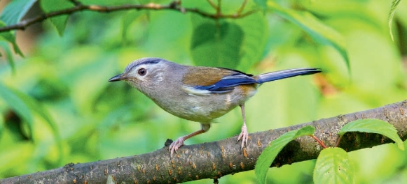 鉴别特征:体长约15 cm。体羽多为灰褐色,头顶蓝灰色,具细的黑色羽轴纹,翼及尾羽蓝色。