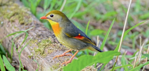 鉴别特征:体长约15 cm。上体多为橄榄绿色,喙红色容易识别。眼周和喉部黄色。