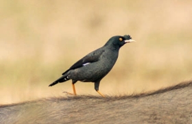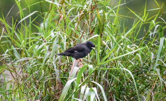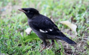 相似种:林八哥。喙橘黄色,尾下白斑宽而明显。