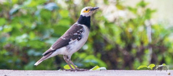 鉴别特征:体长约28 cm的黑白色椋鸟。雄鸟头部白色,眼周皮肤黄色,颈部、下喉部及上胸部具黑色领环。背部及双翼为黑色,并具白色斑块。雌鸟似雄鸟但多偏褐色。