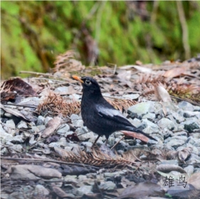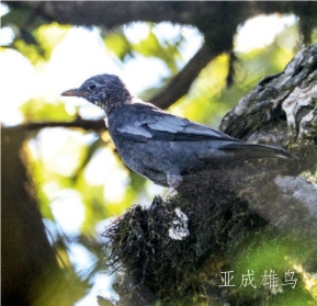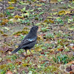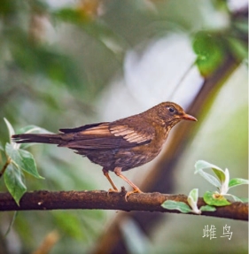 鉴别特征:体长约28 cm。雄鸟体羽多黑色,具显著的灰色翼斑,喙橘黄色。雌鸟体羽橄榄褐色,翼斑黄褐色。